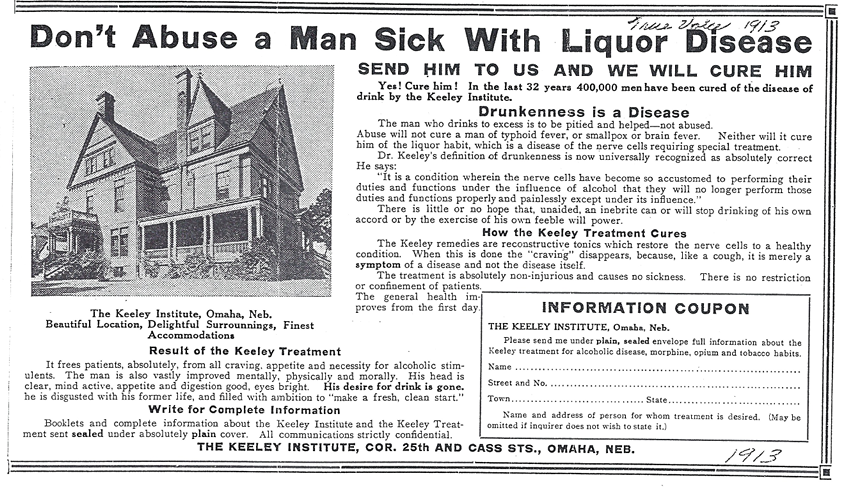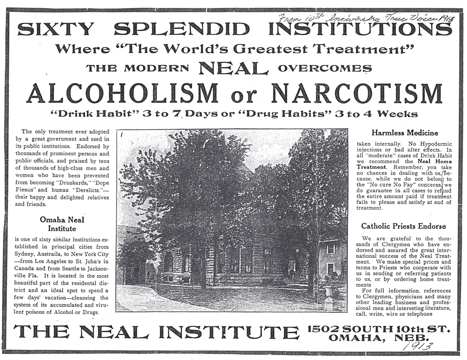 Prior to the founding of A.A. in 1935, a variety of treatments for alcoholism were available to the problem drinker. The Keeley Institute (25th and Cass Streets) and the Neal Institute (South 10th Street) were present in Omaha as early as 1913. The True Voice, a Catholic weekly publication, published advertisements for these treatments.