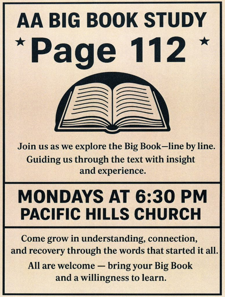 New Big Book Study meeting has started at the Pacific Hills Church (90th and Pacific).
